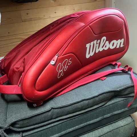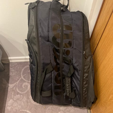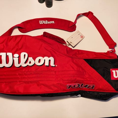 Wilson tennisväska i svart med röda detaljer. Väskan har flera fack och justerbara axelremmar för bärkomfort.