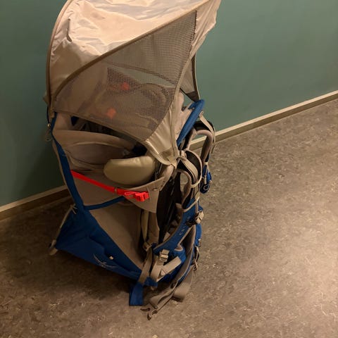 Macpac possum bärstol i blågrön/ orange färg.
