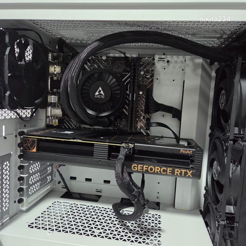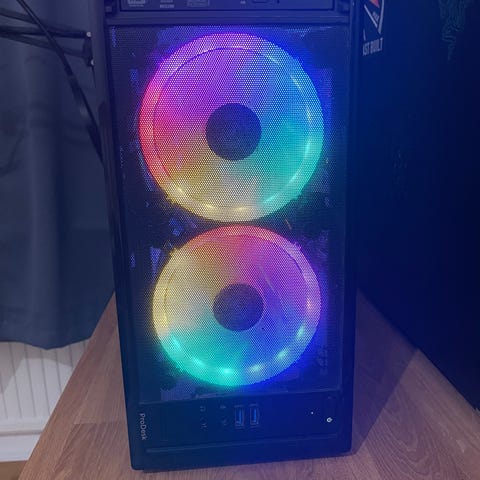 Acer desktopdator i svart färg. Datorn har en GeForce GTX grafikkort och är utrustad med fläkt för kylning. Den har flera portar på baksidan för anslutning av externa enheter. Komplett med tangentbord, Mus och headset