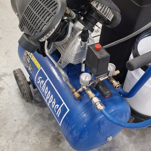 Biltema oljefri Kompressor med en tankvolym på 90 liter i blå färg. Kompressorn är utformad för att användas vid olika tryckluftsapplikationer och är utrustad med hjul för enkel förflyttning.