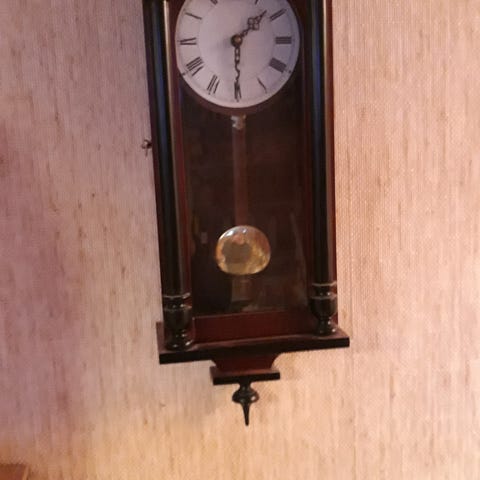 IKEA väggklocka med rund form, svart ram och vit urtavla. Klockan har svarta siffror och visare, och drivs med kvartsurverk.