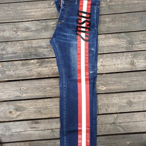 Dsquared2 jeans i blå denim för herr, storlek 50 med midjemått W34. Byxorna har klassisk design med fem fickor och märkets logotyp på bakfickan.
