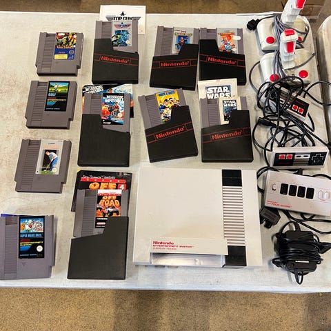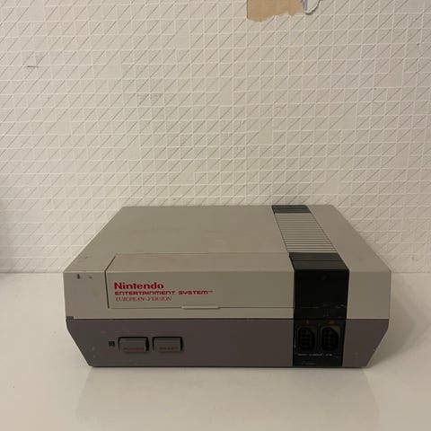 Nintendo NES spelkonsol i standardstorlek med klassisk design. Inkluderar handkontroll med riktning och två röda knappar. Används för att spela Nintendo-spel från 8-bitars generationen.