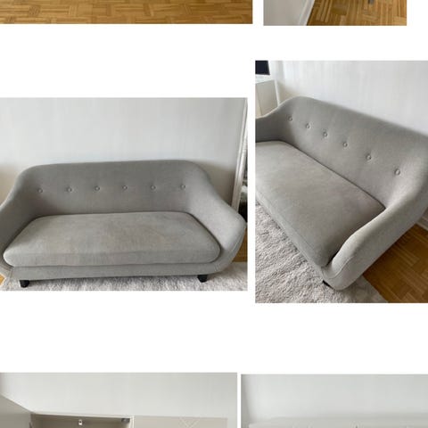 Mio soffa designad av Aage Petersen i grått tyg. Soffan har en modern form med knappar i ryggstödet och en låg profil. Passar för vardagsrum och andra sittutrymmen.