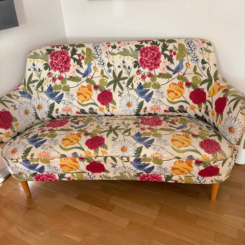 Sittdynorna är omklädda för ca 5 år sedan med tyg från Svenskt tenn, men har slitage/hål.