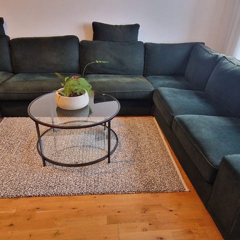 Soffan är rymlig, bekväm och stabil, perfekt för både familj och vardagsrum med öppen planlösning. Klädseln är i gott skick utan fläckar eller slitage. Alla dynor håller formen väl.