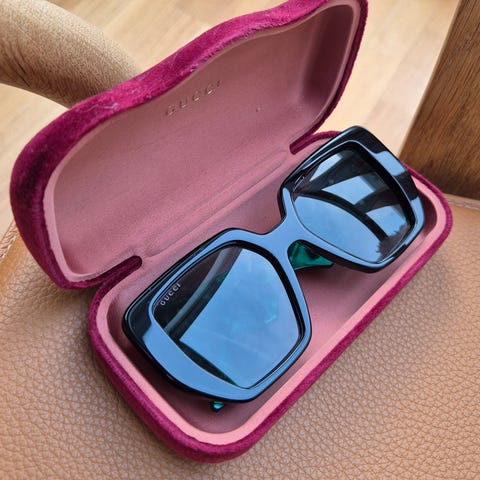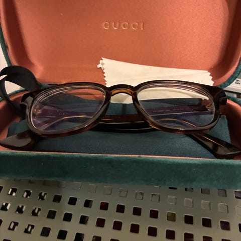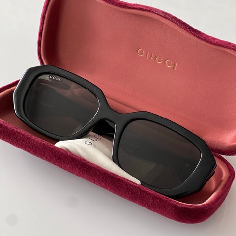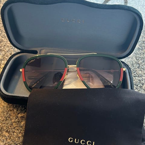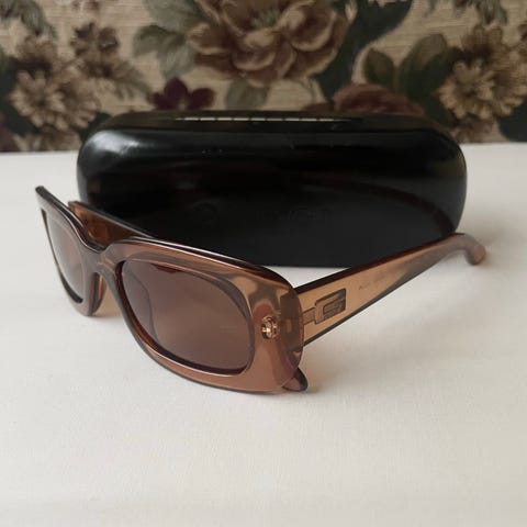 Gucci solglasögon med brunmelerad båge och tonade glas. Glasögonen levereras med ett hårt fodral, original Gucci.