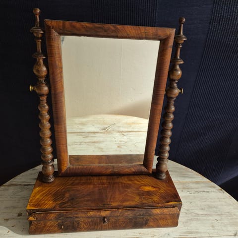 Spegel, jugendstil, ståtlig, 225 cm hög med dekorativt solmotiv. Materialet är trä med en varm, brun finish. Gediget arbete. Ett härligt blickfång. Har inte möjlighet att ha den kvar då jag flyttar.