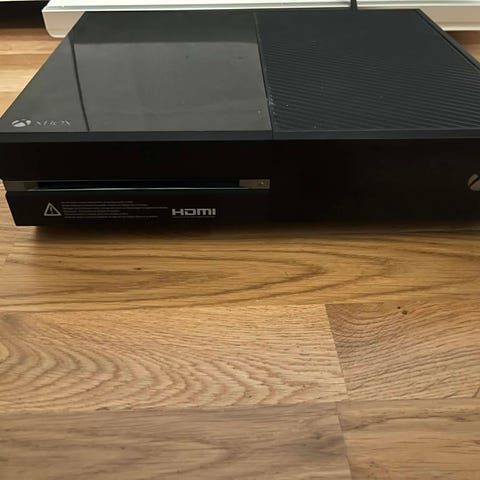 Xbox One spelkonsol inklusive handkontroll och nödvändiga kablar. Konsolen har en svart yta med en kombination av blank och matt finish. Passar för spel och underhållning på TV.