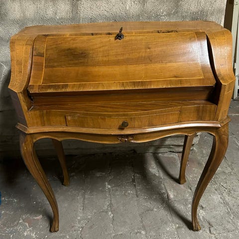 Sekretär, även känd som chiffonjé med nedfällbar skrivyta (klaff) som döljer ett inre fack med många små lådor och fack, placerat ovanför 3 större byrålådor.