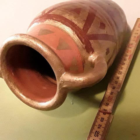 Gammalt djur figurin - sittande valp - tax figurin i fast lera (terrakotta ) iodaterades ålder men troligen förre 1900. . Liten dekorativ figur, som kan markera ditt bord eller utställningshylla, Det är alltså möjligt att det för någon var en skyddande talisman som ger tur. Valpen i keramik, troligen handgjord i roségrå terrakotta, men känns lite tyngre än vanligt för sin bulk... inget signaturmärke än en eventuell ritning av bokstaven V med en bricka i mitten av bokstaven.. Ingen aning om ursprung och tillverkaren, möjligt kan vara ett arkeologiskt fynd! Skicket i bra antik skick. Mått : Höjd: 8,5 cm. Bredd ca 7 cm.Vikt ca 159g. Pris: 299 kr.