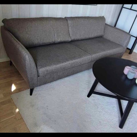 Fräsch soffa utan synliga skador, katt finns i hemmet