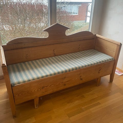 Fin retro bänk m stora förvaringsmöjligheter i den utdragbara lådan- stadig o rejäl _ lätt att byta/ ta av klädsel på locket om en vill