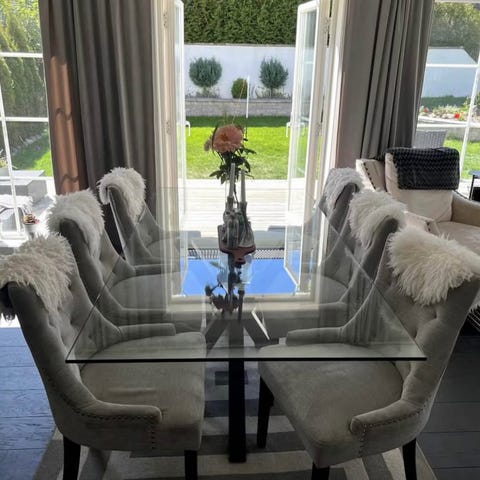 Snyggt matbord med glasskiva och pelarben i metall. Känns luftigt men samtidigt stabilt. Passar bra i moderna hem. Endast bordet, stolar ingår inte.