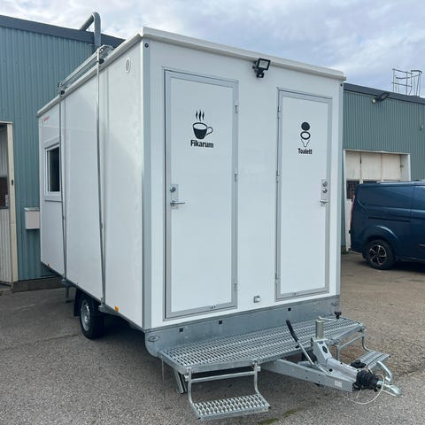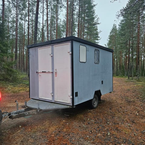 Arbetsvagn i Bra skick, Alde-panna, Belysning 12V/230V, Gasolspis med 2 plattor, Kylskåp Gasol/230V, Diskbänk, Tvättställ, Värmeskåp för mat, 3 Bord med stolar, Långsoffa bak, Stödben fram och bak, Innermått 4,27 x 1,85 m, Totalvikt 1300 kg, Årsskatt 360 kr