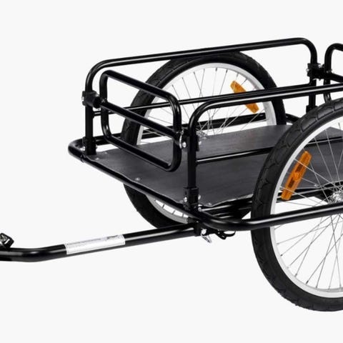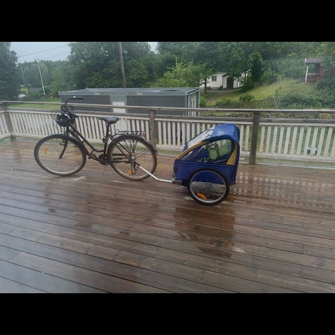 Använd men utan skador cykelvagn, som fungerar bra som löpvagn. 2 olika stora framhjul, koppling till cykel, bebis inlägg ingår.