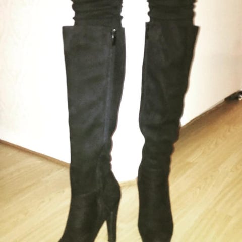 Ett par svarta stövlar i läder, storlek 37, skaft 38 cm, klack höjd 8 cm.
