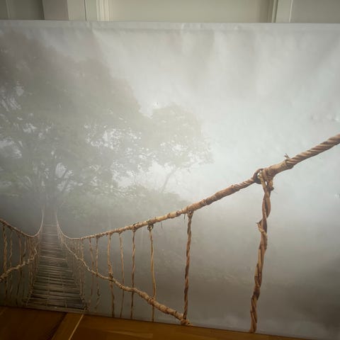 Handgjord av drivved. Bestående av flera små hus monterade som på en brygga. Vägghängd.