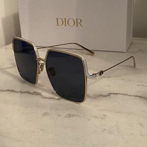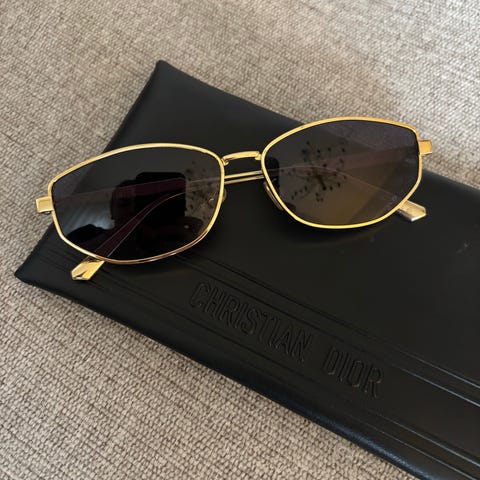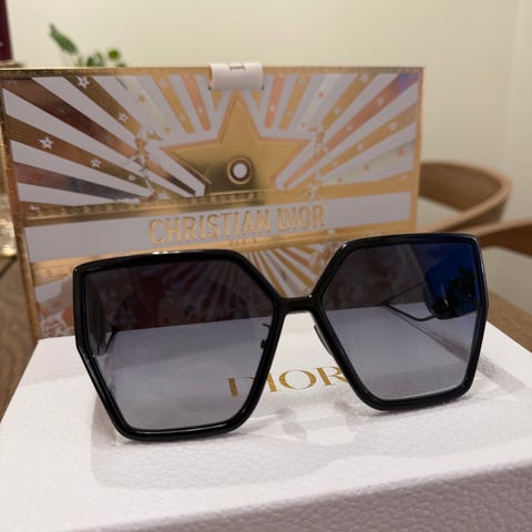 Dior solglasögon för unisex med svart fodral. Glasögonen har en ram i metall och mörka linser. Designen är modern.