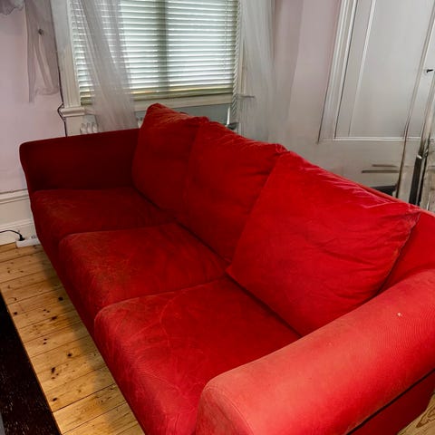 Soffan är ca 7 månader gammal och i bra skick i övrigt, men tyget på ena armstödet är SÖNDER och skadan är ganska stor (se bild).