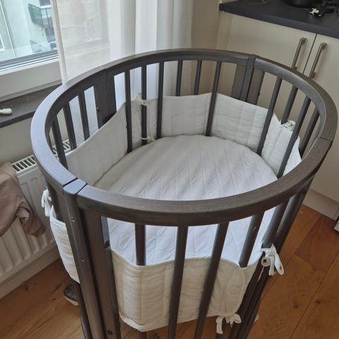 Stokke spjälsäng med rund design i mörkgråfärgat trä. Passar för spädbarn 0-6 månader och kan användas upp till 5 år med förlängningskit (ingår ej).