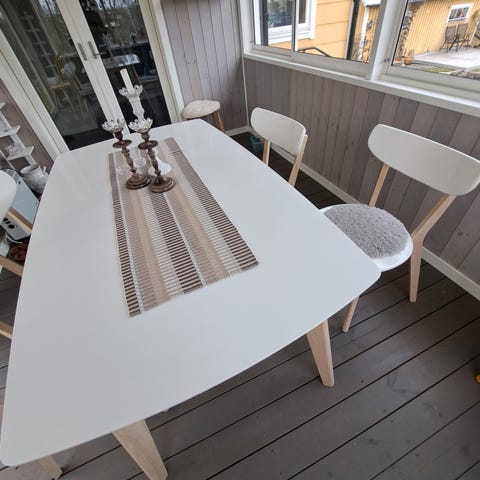 Runt matbord i trä med vit finish samt fyra matchande trästolar med mörkgrå sittdyna. Passar för måltider och samvaro i kök eller matsal.