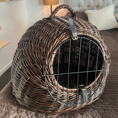 Fint och mysigt katthus i rotting med pläd (dyna ingick inte vid köp). Fin, kupolformad design med öppning framtill, 54 ben av metall. Måtten 32 cm i bredd, 42 cm i djup och 53 cm i höjd. Materialet är naturlig rotting, vilket ger en luftig och hållbar konstruktion. Tyvärr tycker vår katt inte om huset. Inköpt december 2025. Nytt, oanvänt. Nypris 699 kr (bästsäljare på IKEA)