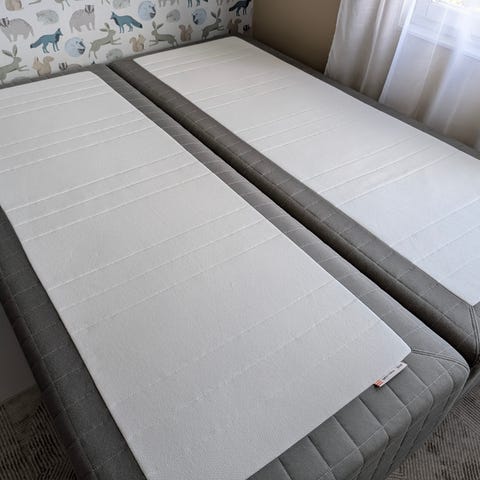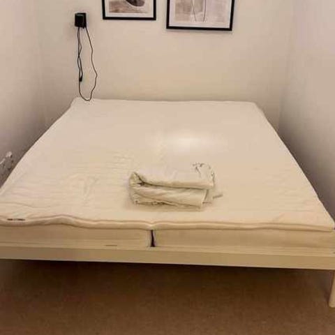 Säng 160cm x 200cm ikea sängstomme vitbetsad trä, med 2st 80x200 skotterud ikea.