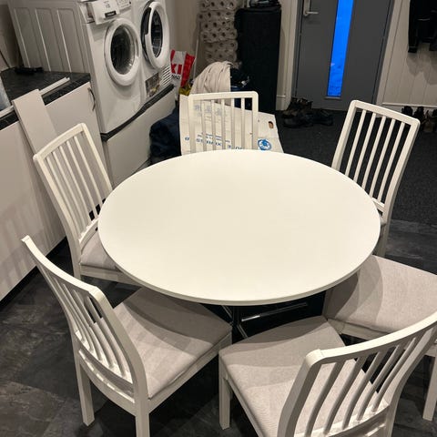 Ett stort runt matbord för 8st personer.