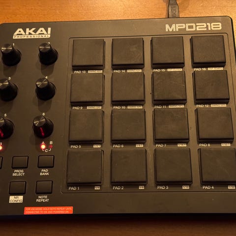 Akai MPK mini är en kompakt MIDI-kontroller med 25 tangenter, 8 trigg-pads och flera rattar för kontroll. Enheten är svart och används för musikproduktion och liveframträdanden.