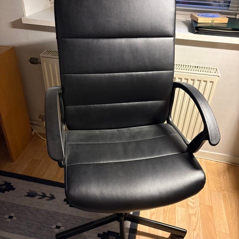 Kontorsstol i svart tyg med hjul och justerbar höjd. Stolen har en ryggstöd och sits med stoppning för sittkomfort. Basen är i svart plast med fem hjul för rörlighet.