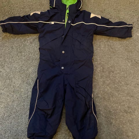 Fin Didriksons barnoverall i fint skick i storlek 92, blå färg, tillverkad i polyester. Overallens material är vattentätt, vilket gör den lämplig för utomhusbruk i fuktiga förhållanden.