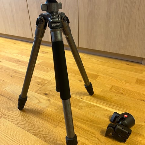 Hama stativ med justerbar höjd och medföljande bärväska i svart färg. Stativet är utformat för att stödja kameror och är lätt att transportera med den medföljande väskan.