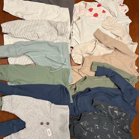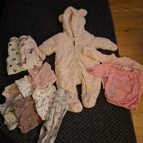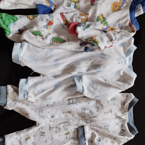 Paket med fem stycken pyjamaser i storlek 50. De är i mycket fint skick, då de knappt hann bli använda.