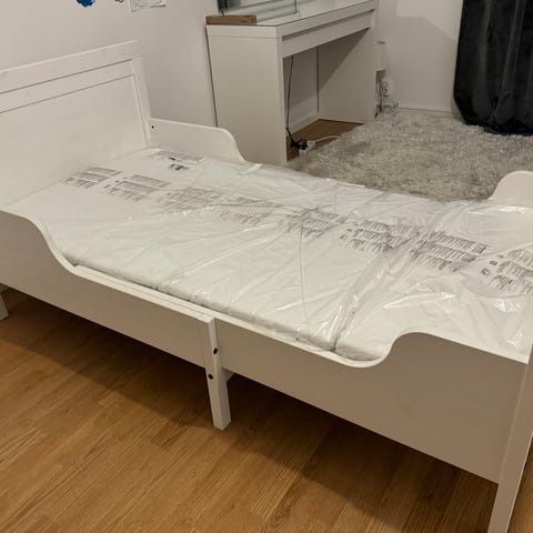 Barnsäng med madrass, madrasskydd ca 6 månader gamla. Sängen är i nästintill oanvänd. Sängbräda (för att förhindra att barnet ramlar över kanten i sömnen) ingår samt halvkoja.