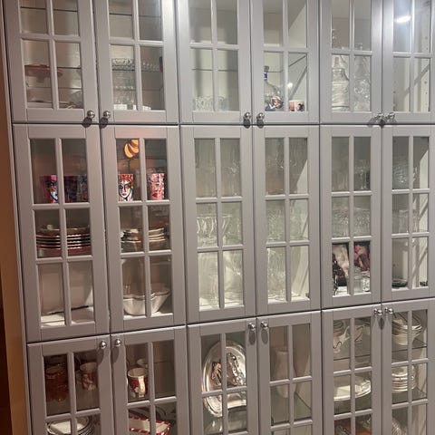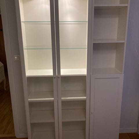 Specialbyggd vitrinskåpsdel kompatibel med ikeas lådor. Glasluckorna specialmått, finns ej på ikea. Höjd 140, djup 40, med de täckskivor och taklister som sitter på ca 146 cm
