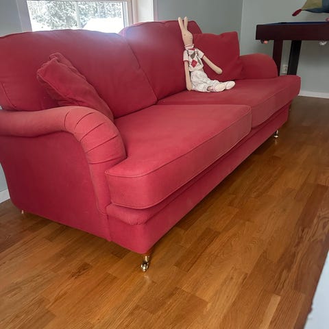 2st svängda soffor i Howard-stil. Fin olivgrön färg. Otroligt tåligt tyg.