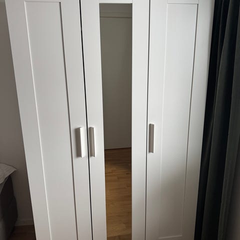 IKEA garderob med tre dörrar, varav en med spegel. Garderoben har flera hyllor och klädstång för förvaring av kläder och andra föremål.