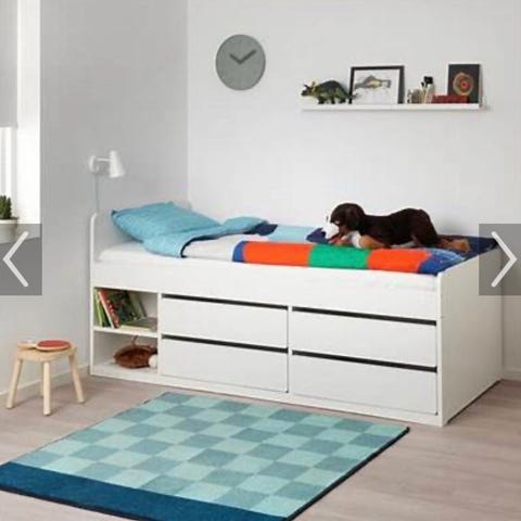 IKEA Släkt säng med förvaring i vitt. Sängen har flera lådor och öppna hyllor för förvaring under sovytan. Passar för barn och ungdomar och är tillverkad i trämaterial med vit yta.
