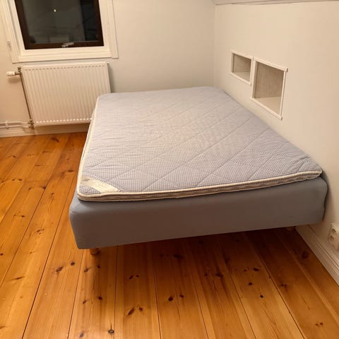 Jysk sängram med ben i trä. Passar för madrass och sängstorlek enligt bilder. Enkel design med ljus färg och träben.