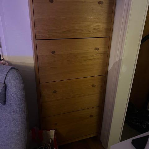 Vitt skoskåp med plats för 12 par låga vuxenskor, 4 st. per låda. Jag har haft den fylld med adidasskor i alla dess färger, se bild. Under den lätt repiga överhyllan finns ett fack för mössa, halsduk, vantar, etc.