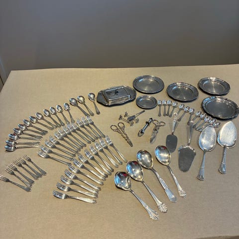 Gamla olika föremål i nysilver.