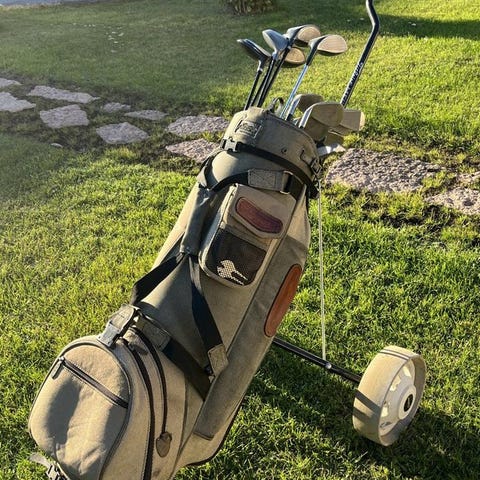 Hopfällbar golfvagn. Golfvagnen är utrustad med tre hjul och hopfällbar design för enkel transport och förvaring. 300kr
