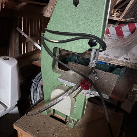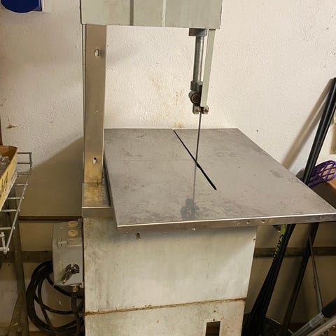 BM BM-45 bandsåg med arbetsbord i metall. Utrustad med motor som drivs på 380 volt, 4,8 ampere, 50 Hz och 910 varv per minut.