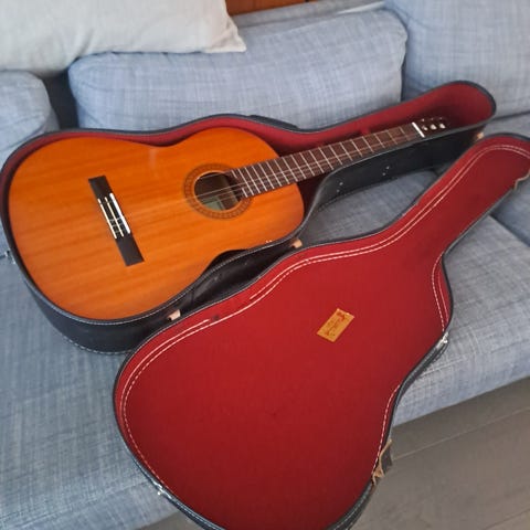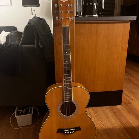 Landola akustisk gitarr med träfinish. Gitarren har just nu inte kompletta strängar. Traditionell design med rund ljudhål och mörk träfärgad hals och baksida. Den levereras med ett svart fodral för skydd och transport.