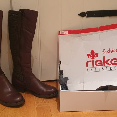 Märke Khrio, innermått 26 cm, passar normal till lite bred fot, vadomfång överst 36 cm med resår överst som tillåter större vad.