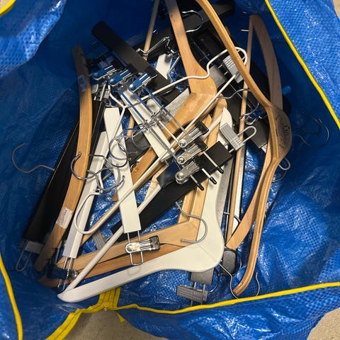 Flera stycken galgar i både plast och i trä, vita/svarta