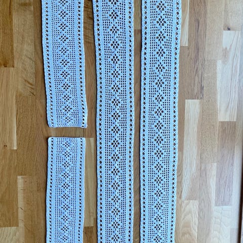 Två vita hemvirkade fönsterdukar/fönsterremsor. 80-tal. 11 cm breda. Den ena är 122 cm lång och den andra är 92 cm lång.