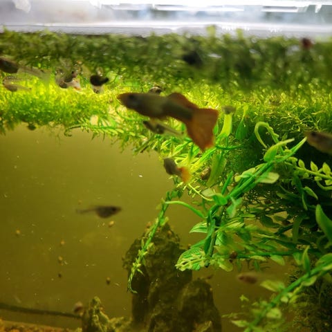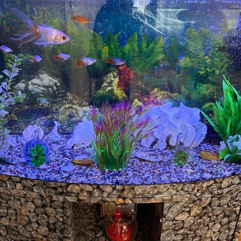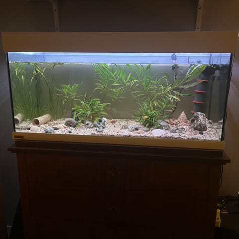 Akvarium med grus, växter, dekorationsstenar och bakgrund. Inkluderar pump, fiskmat och annan utrustning för skötsel av akvariet.