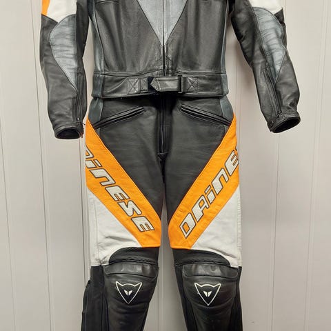 Dainese motorcykelställ i skinn i svart färg. Storlek 50/104. Stället består av jacka och byxa med skydd för motorcykelkörning.